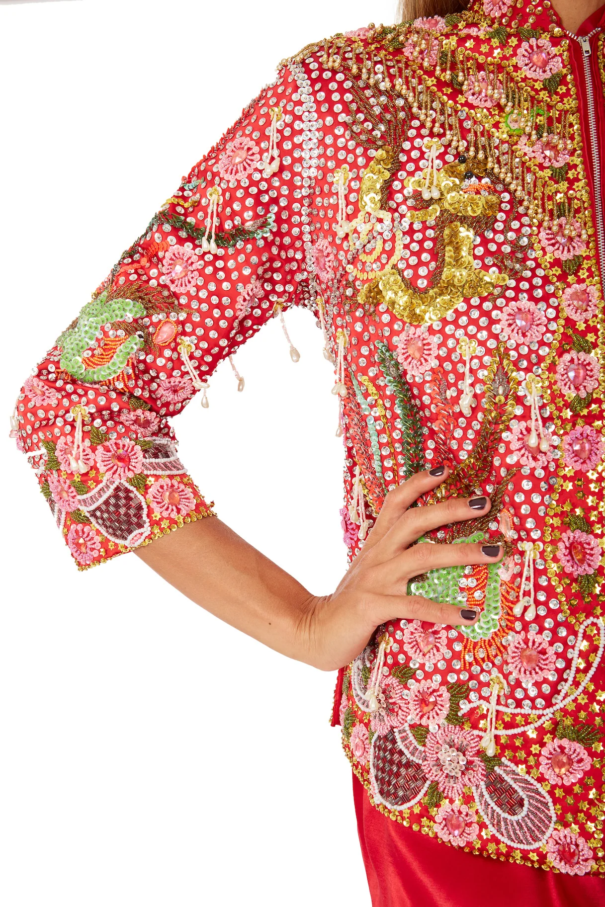 A rare and stunning hand-embellished Chinese jacket circa 1960s with sequin gold dragons and pink beaded flowers
