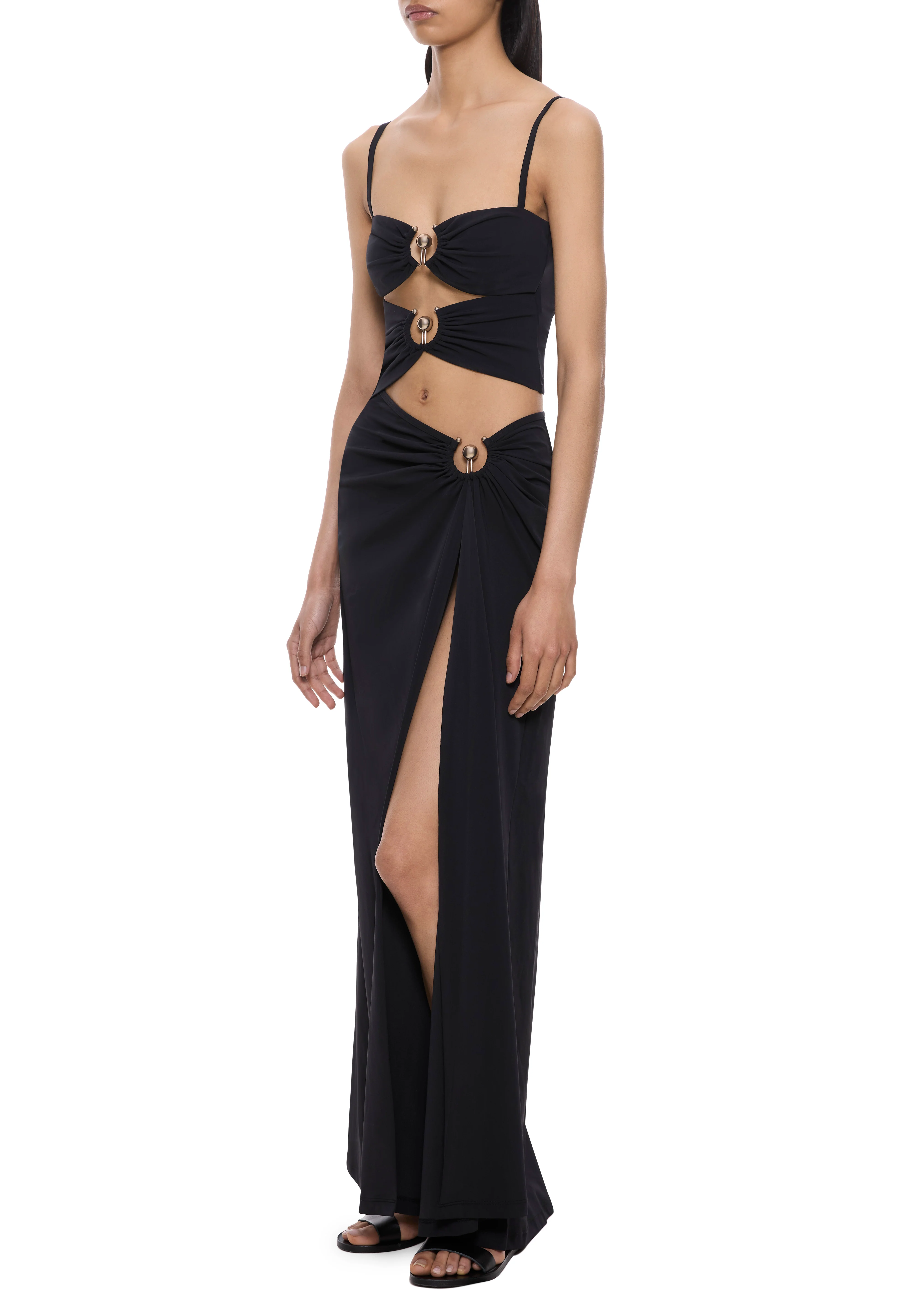 This Black Ruched Orbit Split Maxi Dress features Christopher Esber's signature brass orb hardware artfully positioned at the front and hip. Designed with bold front cut-outs and elegant side ruching, the silhouette contours the body while revealing skin in all the right places. A side slit adds movement
