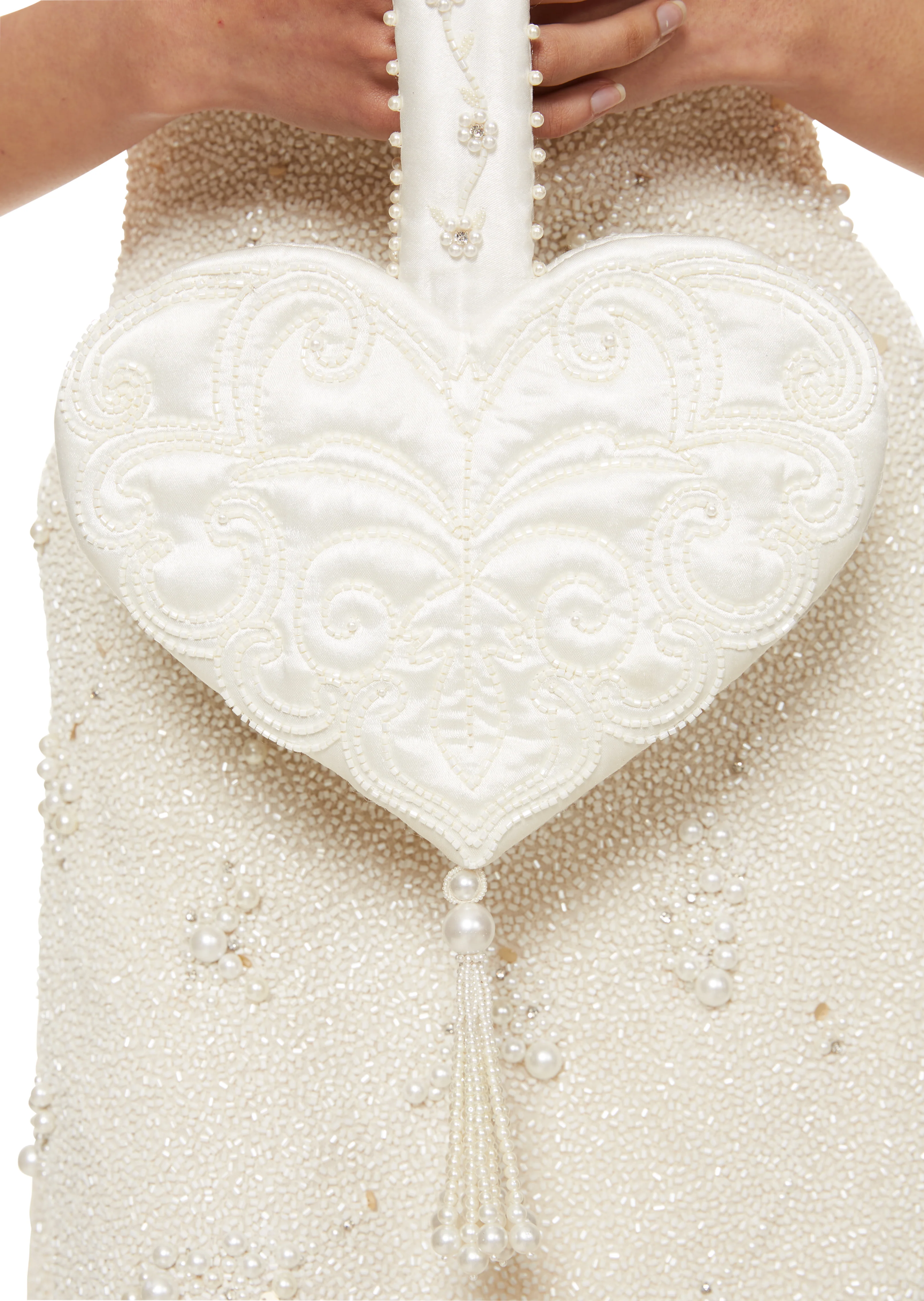 Live in your own magical fairytale with this handmade beaded lady pouch. Crafted from silk satin, the petite, heart shape makes a chic choice for brides to carry on their wedding day.